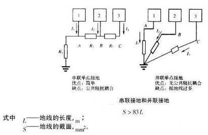 單點(diǎn)接地工作頻率低(<1MHz)的采用單點(diǎn)接地式(即把整個(gè)電路系統(tǒng)中的一個(gè)結(jié)構(gòu)點(diǎn)看作接地參考點(diǎn),所有對(duì)地連接都接到這一點(diǎn)上,并設(shè)置一個(gè)安全接地螺栓),以防兩點(diǎn)接地產(chǎn)生共地阻抗的電路性耦合。多個(gè)電路的單點(diǎn)接地方式又分為串聯(lián)和并聯(lián)兩種。由于串聯(lián)接地產(chǎn)生共地阻抗的電路性耦合,所以低頻電路最好采用并聯(lián)的單點(diǎn)接地式。